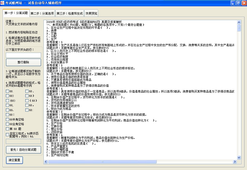 上面的“首先:自動(dòng)分離試題”按鈕命令執(zhí)行結(jié)束后,導(dǎo)入程序主窗口會(huì)自動(dòng)切換到“第二步:分離選項(xiàng)”頁(yè)面,如下圖所示。