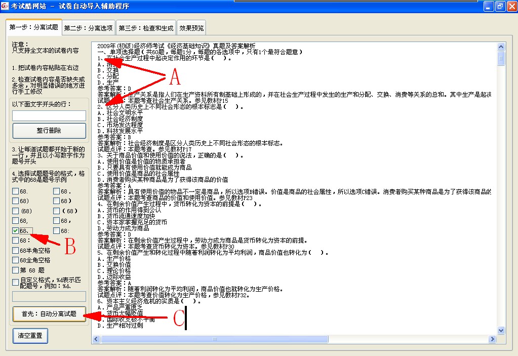然后,點(diǎn)擊“首先:自動(dòng)分離試題”按鈕,如下圖“C”處所示。