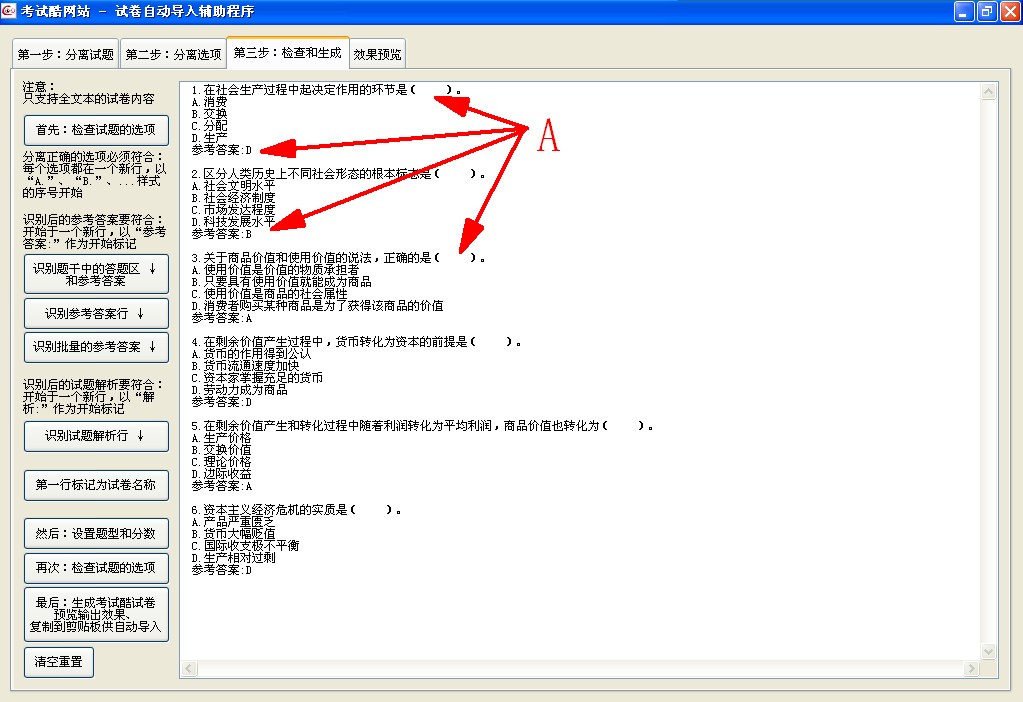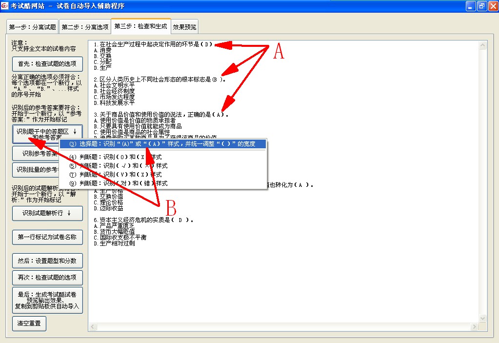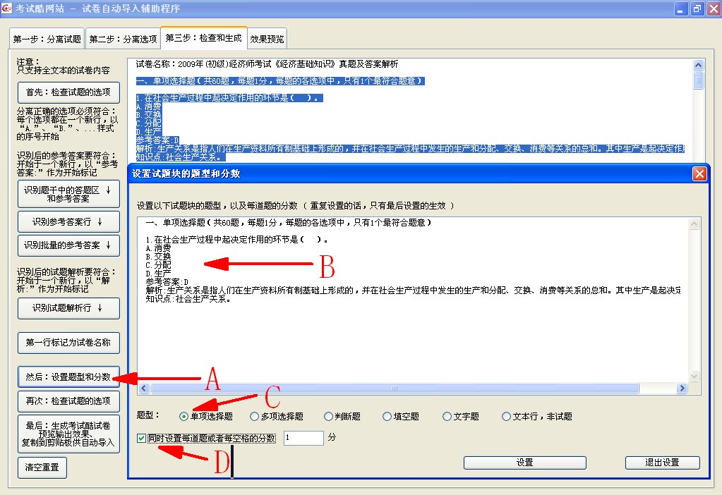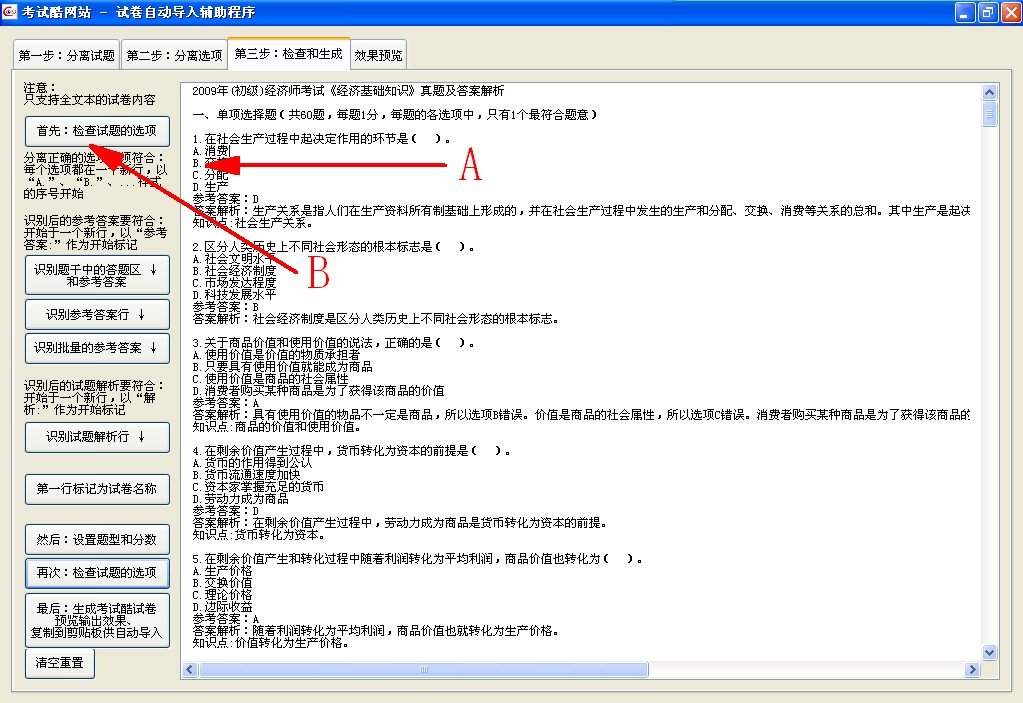 設(shè)置好題型和分?jǐn)?shù)后,就是點(diǎn)擊“再次:檢查試題的選項(xiàng)”按鈕,如上圖“C”處所示,因?yàn)橛辛嗽O(shè)置好的題型,就可以進(jìn)行更加嚴(yán)格的檢查,以便盡可能地找出格式錯(cuò)誤的地方,并進(jìn)行手工修正。