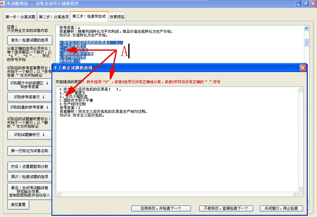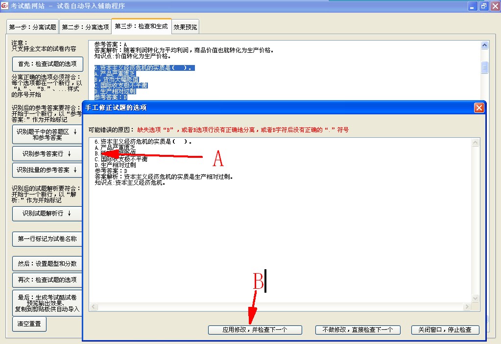 這時(shí),只要在“手工修正試題的選項(xiàng)”窗口中,將試題和試題的選項(xiàng)修改為正確的格式(正確的格式是每個(gè)選項(xiàng)序號(hào)都由一個(gè)A/B/C/D/E/F/G字符和一個(gè)“.”符號(hào)組成),再點(diǎn)擊“應(yīng)用修改,并檢查下一個(gè)”按鈕,如下圖“A”和“B”處所示。