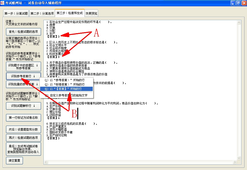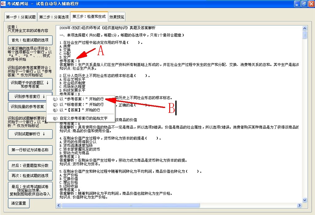 如下圖“A”處所示,原始試卷里,參考答案都是以文字“參考答案:”作為開(kāi)始的行。這樣,我們就可以利用“識(shí)別參考答案行”按鈕菜單中的‘(1) 以“參考答案:”開(kāi)始的行’命令來(lái)自動(dòng)識(shí)別所有的參考答案,如下圖“B”處所示。