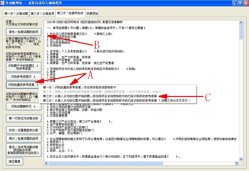 然后,點(diǎn)擊“然后:分離試題的選項(xiàng)”按鈕,如下圖“C”處所示。