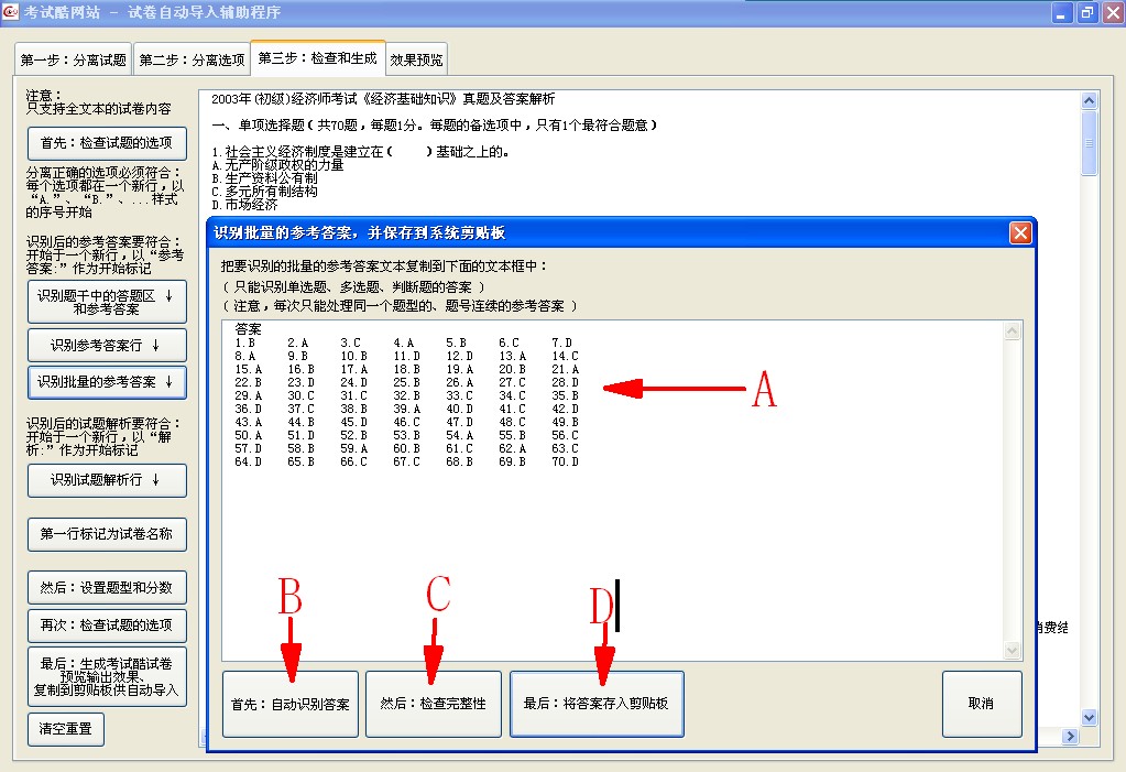在該窗口中,首先把參考答案復(fù)制到文本框中,點(diǎn)擊“首先:自動(dòng)識(shí)別答案”按鈕,然后點(diǎn)擊“然后:檢查完整性”按鈕,如果完整性沒(méi)有問(wèn)題,軟件提示檢查通過(guò)的話,就可以點(diǎn)擊“最后:將答案存入剪貼板”按鈕,如下圖A、B、C、D處所示。至此,識(shí)別答案的步驟①就已經(jīng)完成。