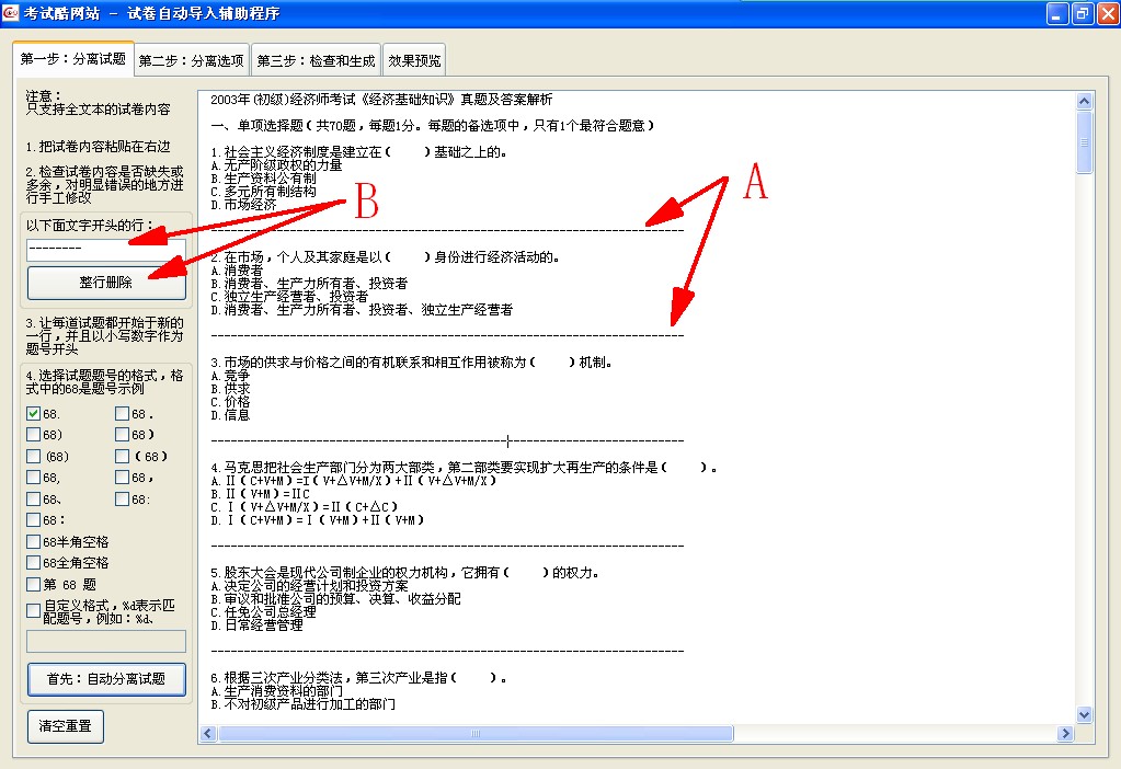 如下圖“A”處所示,我們獲得的原始試卷里,可能每個(gè)試題之間存在一條分隔線。但是我們做自動(dòng)識(shí)別和導(dǎo)入試卷時(shí),并不需要它們,所以要?jiǎng)h除它們。如果手工地一行一行地去刪除,當(dāng)然麻煩又費(fèi)事了。這時(shí),只須把要?jiǎng)h除行的最前面幾個(gè)字符(確保以這幾個(gè)字符開(kāi)頭的行都是要?jiǎng)h除的)復(fù)制到如下圖“B”處所示的文字框中,然后點(diǎn)擊“整行刪除”按鈕,則試卷里所有符合這個(gè)條件的行會(huì)一次性地被全部刪除了。