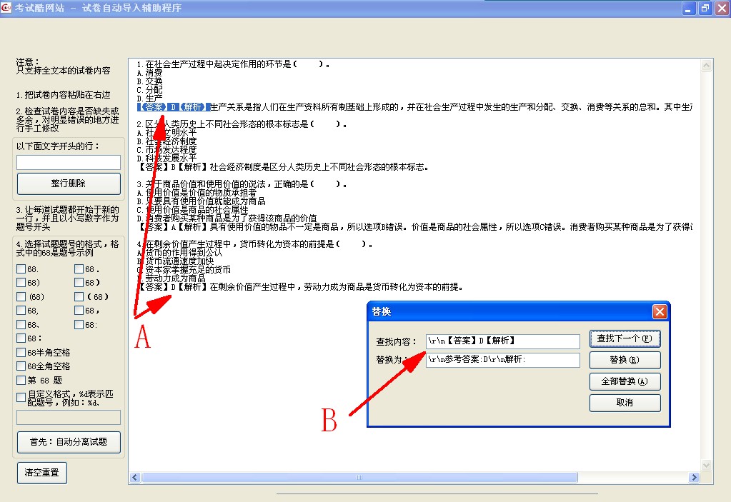 這時(shí),可以通過(guò)返回“第一步:分離試題”頁(yè)面重新設(shè)置要識(shí)別的題號(hào)格式,通過(guò)增加對(duì)“68,”樣式的識(shí)別,并重新執(zhí)行自動(dòng)分離試題操作,以便獲得正確地識(shí)別和分離?;蛘?,也可以直接進(jìn)行手工地修改。如下圖“B”處所示,我們可以手工修改為正確的格式。正確的格式是:試題與試題、試題與其他文字描述行之間,都有也僅有一個(gè)空行隔開(kāi);所有的試題題號(hào)都是一個(gè)數(shù)字和一個(gè)“.”符號(hào)組成。