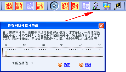 對于這種原因,軟件提供了一種解決辦法。請看左圖,在啟動“教師演示”或“學生示范”狀態(tài)下,在屏幕右上角顯示的懸停工具條上,直接點擊“設置演示或示范電腦上的網(wǎng)絡性能補償值”這個按鈕(圖中箭頭所指),打開的“設置網(wǎng)絡性能補償值”窗口中,可以將網(wǎng)絡性能補償值設置為0~50中的某個值,這樣的話,就可以達到速度匹配的目的,但屏幕畫面廣播的速度將因此而降低。這個網(wǎng)絡性能補償值越大,則意味著補償越多,越能使得教師機和學生機的速度得到匹配。一般來說,需要通過實際測試得到一個最佳匹配速度的補償值。