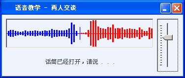 如圖所示,窗口左邊顯示的是正在錄音的波形,也就是您自己的聲音;而窗口右邊則是正在播放的波形,也就是對(duì)方的聲音。位于窗口右方的音量控制器允許您改變播放聲音的音量大小。