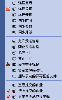 當您選擇了“遠程重啟”或“遠程關機”時,軟件會提示您是否選擇“強制重啟或關閉學生機(沒有保存的數(shù)據可能會丟失)”,如果不選擇,則需要關機或重啟的學生機電腦上如果有正在編輯而沒有保存的文件,系統(tǒng)會提示您是否保存相關的文件,這樣,在沒有作出選擇之前,關閉或重新啟動的操作會暫時掛起,直到您作出具體選擇后才能繼續(xù)的。