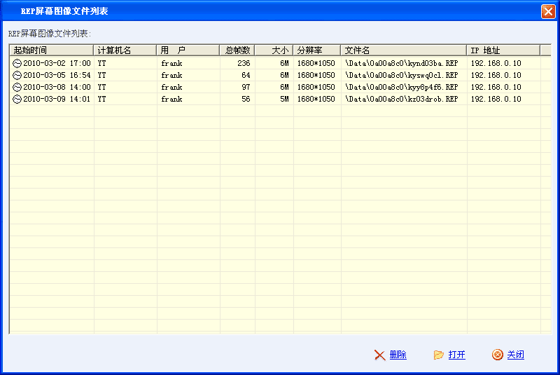 列表中顯示的屏幕圖像文件包含一些基本信息:起始時間、計算機名、用戶、總幀數(shù)等,您可以根據(jù)這些信息區(qū)別眾多的文件,點擊各列支持排序。