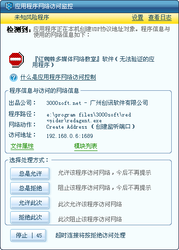 1. 紅蜘蛛軟件安裝時,瑞星個人防火墻可能會彈出如下的提示窗口,這個時候要在“選擇處理方式”中選擇“總是允許”按鈕才行。