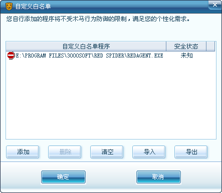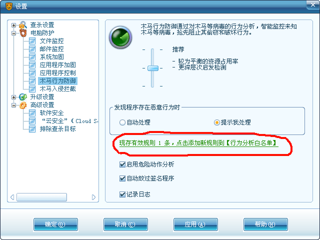 如下面圖8所示的,打開瑞星殺毒軟件的“設(shè)置”窗口,進(jìn)入“電腦防護(hù)”->“木馬行為防御”頁面,在圖示紅框內(nèi)的鏈接上單擊,它會打開圖9所示的“自定義白名單”窗口,在該窗口上,通過“添加”按鈕將紅蜘蛛軟件安裝目錄下的REDAgent.exe文件加入進(jìn)去。