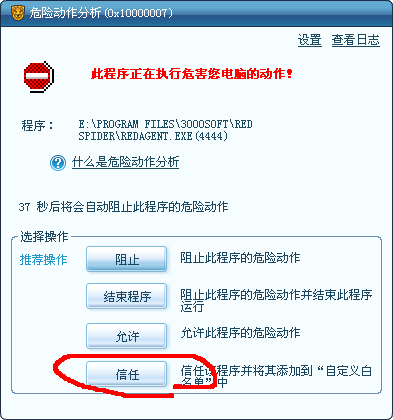 如果在學(xué)生機(jī)上的瑞星殺毒軟件沒有做這個自定義白名單設(shè)置,則當(dāng)在紅蜘蛛軟件中操作“黑屏肅靜”、“教師演示”或“學(xué)生示范”等功能時,會導(dǎo)致瑞星殺毒軟件提示下面圖10所示的“危險動作分析”消息框,這時就要單擊紅框內(nèi)所示的“信任”按鈕才能繼續(xù)讓紅蜘蛛軟件正常運(yùn)行。