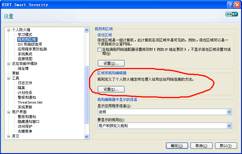 然后,如下面圖12紅框位置所示,在左邊“個人防火墻”節(jié)點(diǎn)下選擇“規(guī)則和區(qū)域”,然后在右邊的“區(qū)域和規(guī)則編輯器”里單擊“設(shè)置(E)…”按鈕。該按鈕會打開如下面圖13所示的“區(qū)域和規(guī)則設(shè)置”窗口。