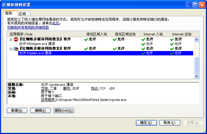 通過“區(qū)域和規(guī)則設(shè)置”窗口上的“新建(N)”按鈕,可以把紅蜘蛛軟件中所涉及網(wǎng)絡(luò)通信功能的EXE程序文件都加入到規(guī)則中。如果涉及紅蜘蛛軟件所使用的EXE程序文件條目已經(jīng)在列表中存在,則需要相應(yīng)地更改其設(shè)置,以全部允許其Internet入站出站連接。