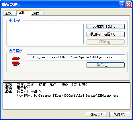 需要注意的是,在新建或者編輯這些規(guī)則的時候,方向要選擇“二者”,操作要選擇“允許”,而協(xié)議則要選擇“TCP & UDP”,如下面圖15所示。應(yīng)用程序文件名則通過“本地”頁面上的“瀏覽”按鈕去選擇,如下面圖14所示。