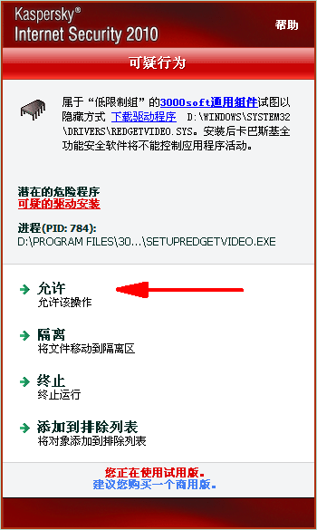 紅蜘蛛軟件要在Windows\system32\drivers目錄下安裝RedGetVideo.sys驅(qū)動程序,以便提供加速的3D視頻畫面的廣播效果。如果系統(tǒng)上安裝有卡巴斯基的殺毒和安全軟件,它會彈出如下面圖16所示的“可疑行為”的提示窗口,這個時候,你需要選擇其中的“允許”操作以便允許紅蜘蛛軟件繼續(xù)正常地完成安裝。