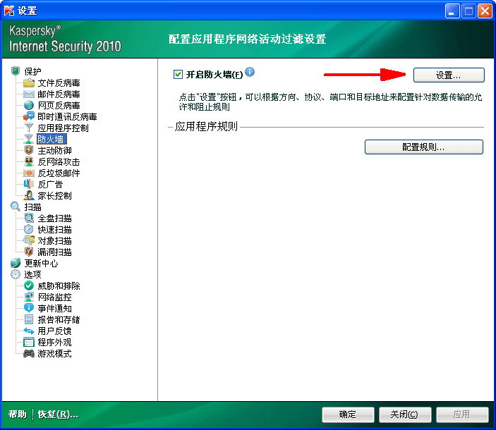 卡巴斯基全功能安全軟件,是內(nèi)嵌有防火墻功能的,需要正確設(shè)置它才能保證不影響紅蜘蛛軟件的使用。從系統(tǒng)托盤區(qū)上卡巴斯基安全軟件的圖標(biāo)上,單擊鼠標(biāo)右鍵,在彈出的右鍵菜單上選擇“設(shè)置”項進(jìn)入,它會打開如下面圖17所示的“設(shè)置”窗口。