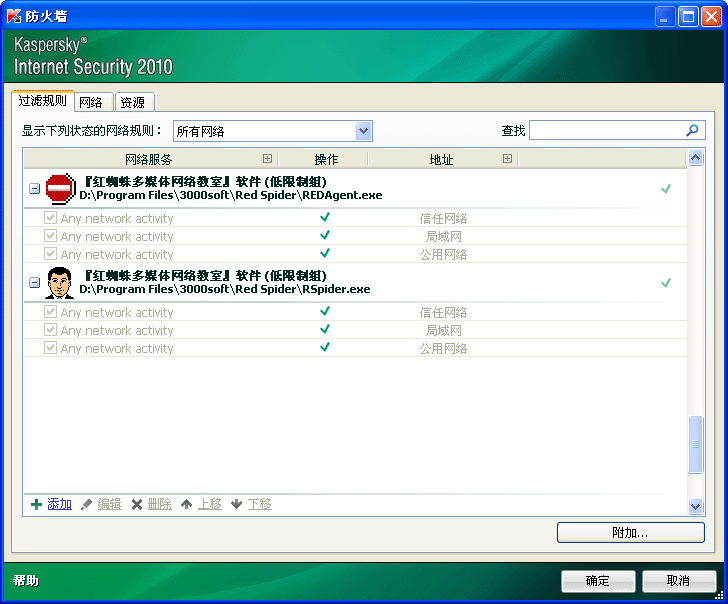 無論是先安裝了紅蜘蛛軟件,還是先安裝了卡巴斯基全功能安全軟件,都需要進(jìn)入圖18所示的窗口里去驗證過濾規(guī)則是否設(shè)置正確,以確保紅蜘蛛軟件能夠正常地訪問網(wǎng)絡(luò),并能正確地接收來自教師機(jī)或?qū)W生機(jī)的網(wǎng)絡(luò)指令。
