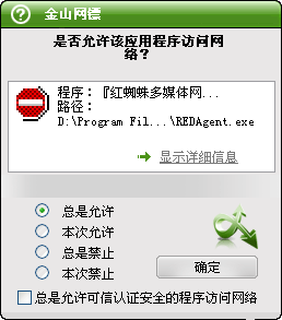 紅蜘蛛軟件安裝時,金山網(wǎng)鏢可能會彈出如下面圖19和圖20所示的提示窗口,這個時候要在窗口上選擇“總是允許”選項,再單擊“確定”按鈕才行。