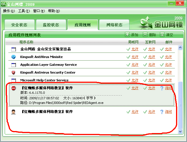 響應(yīng)上述設(shè)置后,可以在金山網(wǎng)鏢軟件的“應(yīng)用規(guī)則”窗口上見到如下面圖21所示的2個(學(xué)生機(jī)上是1個)設(shè)置項,其“局域網(wǎng)”和“互聯(lián)網(wǎng)”的規(guī)則狀態(tài)都是“允許”。